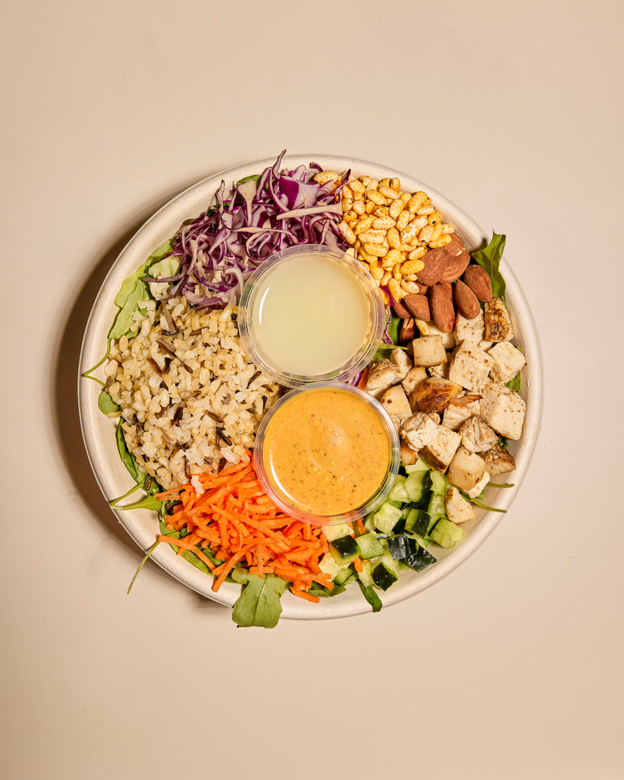 Toppings: Lombarda, pepino, zanahoria, almendras, arroz crujiente